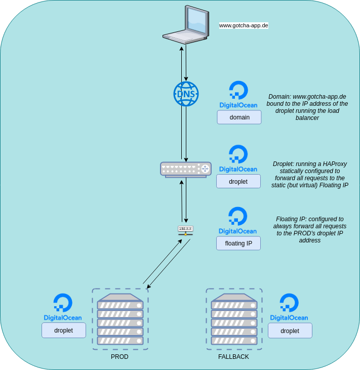 The point of that setup is: We will have a domain http://www.gotcha-app.de. When a user enters http://www.gotcha-app.de the request will be redirected to the load balancer. The load balancer will take the request and forward it to the floating IP. A DigitalOcean Floating IP is static and we are able to bind one droplet (its ip) to that static IP. This is great because we can configure our load balancer to forward all requests to that static IP, but on the other hand we are able to dynamically switch the target behind that IP so later we can decide if requests to that IP will be forwarded to our droplet with the most current version of our web app running or to the droplet with the previous version.